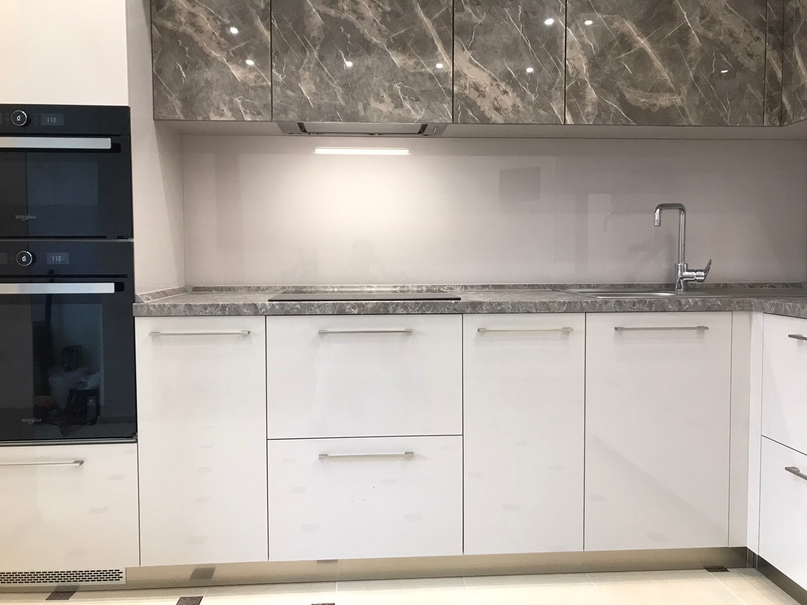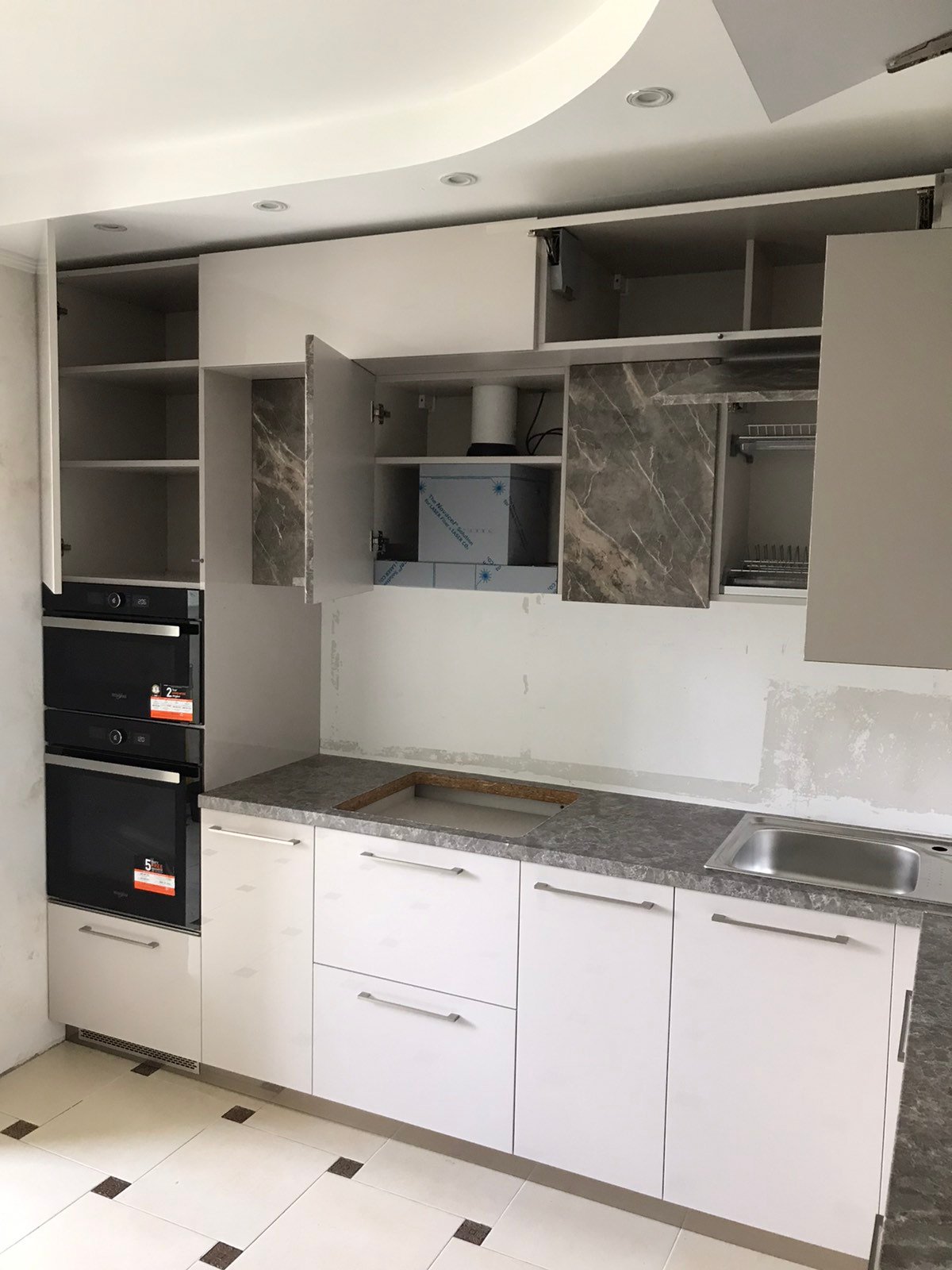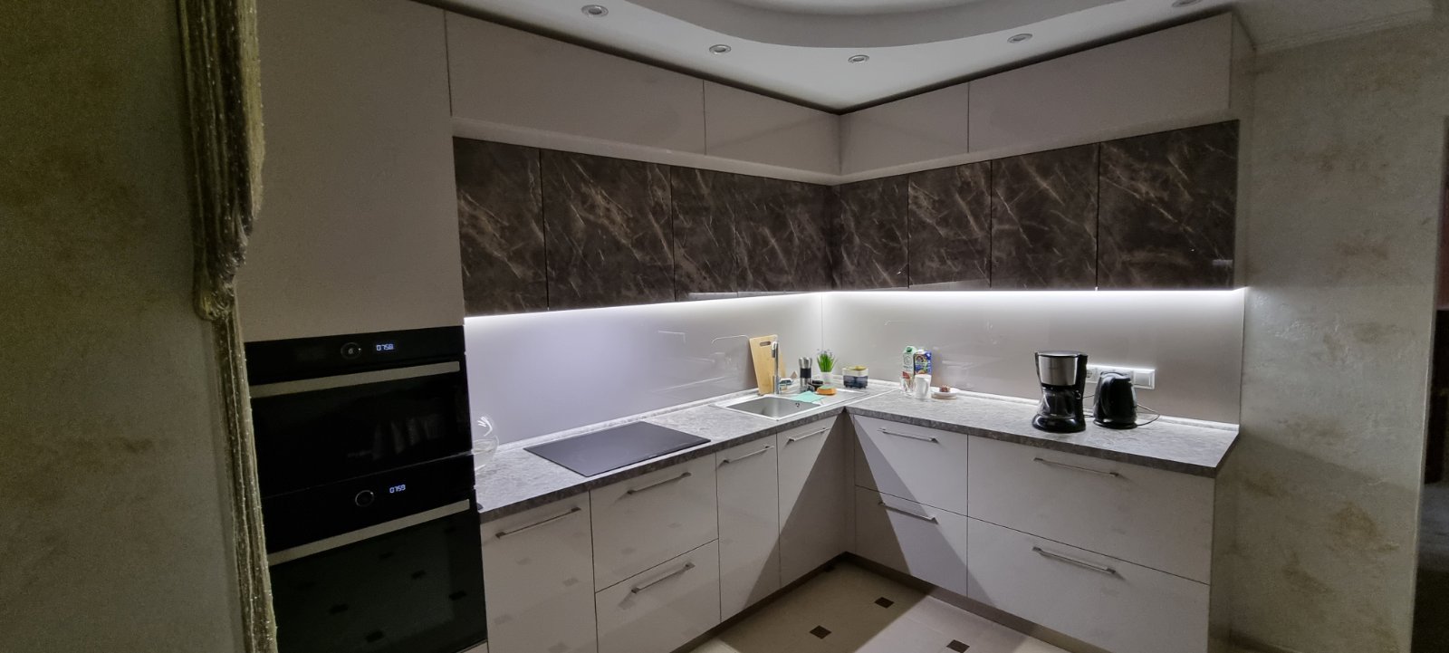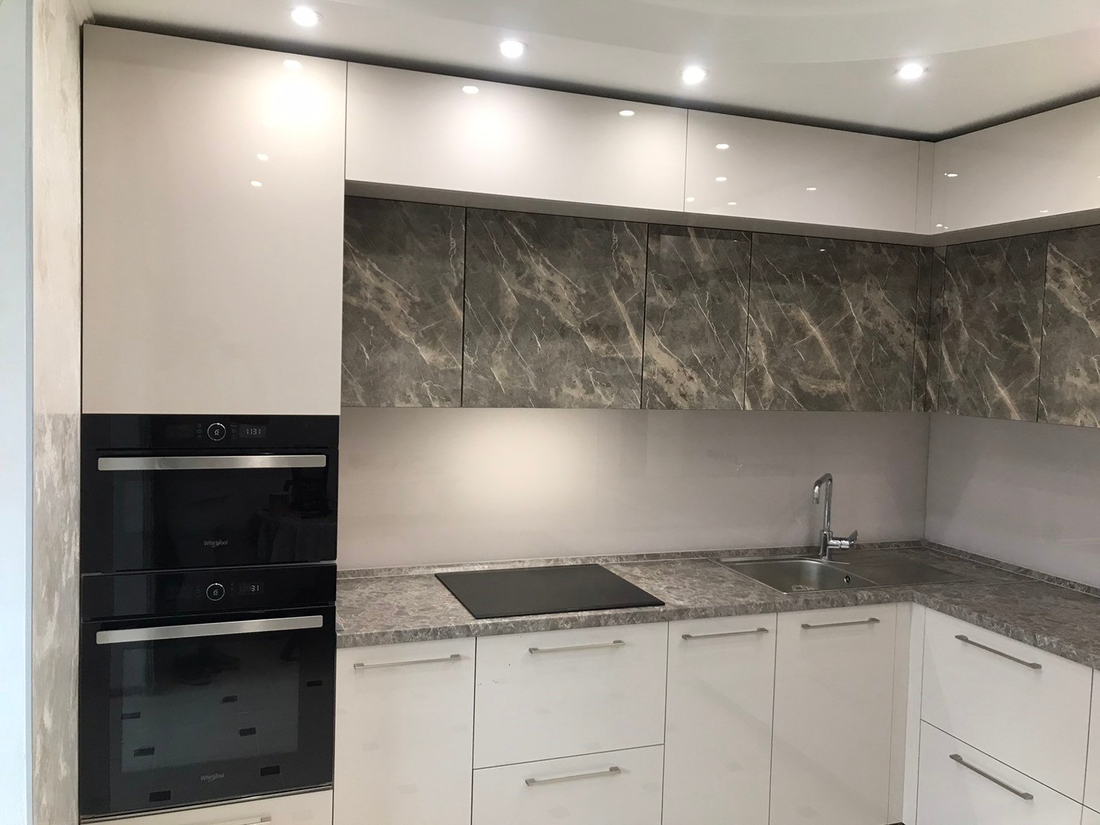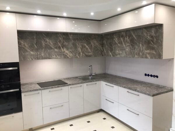 Меблі в кухню виконані в сучасному стилі. Поєднання декорів мрамору та каміння в дизайні меблів   створює динамічне враження, це – стильно та актуально. А сучасні акрилові  глянцеві фасади додають вишуканості кухні. Конструкція  складна, двохрівнева, кутова,  з високим пеналом з вбудованною технікою та  максимально функціональна, використані сучасні та якісні матеріали.